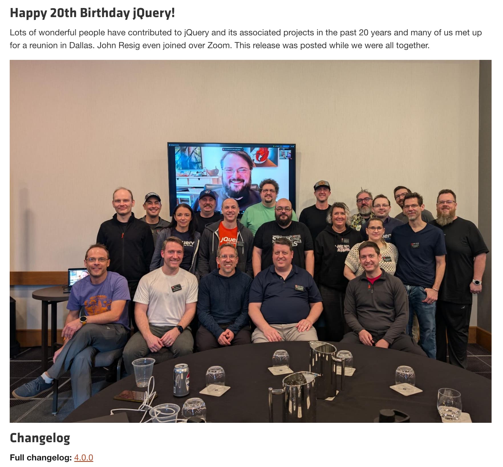 2026.01.17 jQuery 发布了 4.0.0 版本,对,你没听错,是 jQuery,青春回来了,当然也看到不少人在回复:最近才维护完一个古老项目,用的 jQuery 🐶
